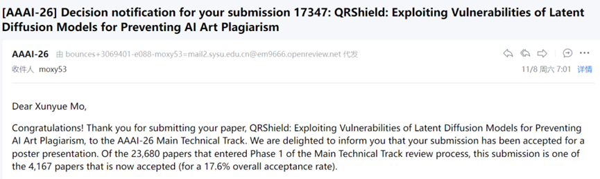 近日,在软件工程学院吴炜滨副教授指导下,2023级本科生莫勋悦以第一作者身份首次投稿的学术论文“QRShield: Exploiting Vulnerabilities of Latent Diffusion Models for Preventing AI Art Plagiarism”被人工智能领域的国际顶级会议AAAI 2026接收。