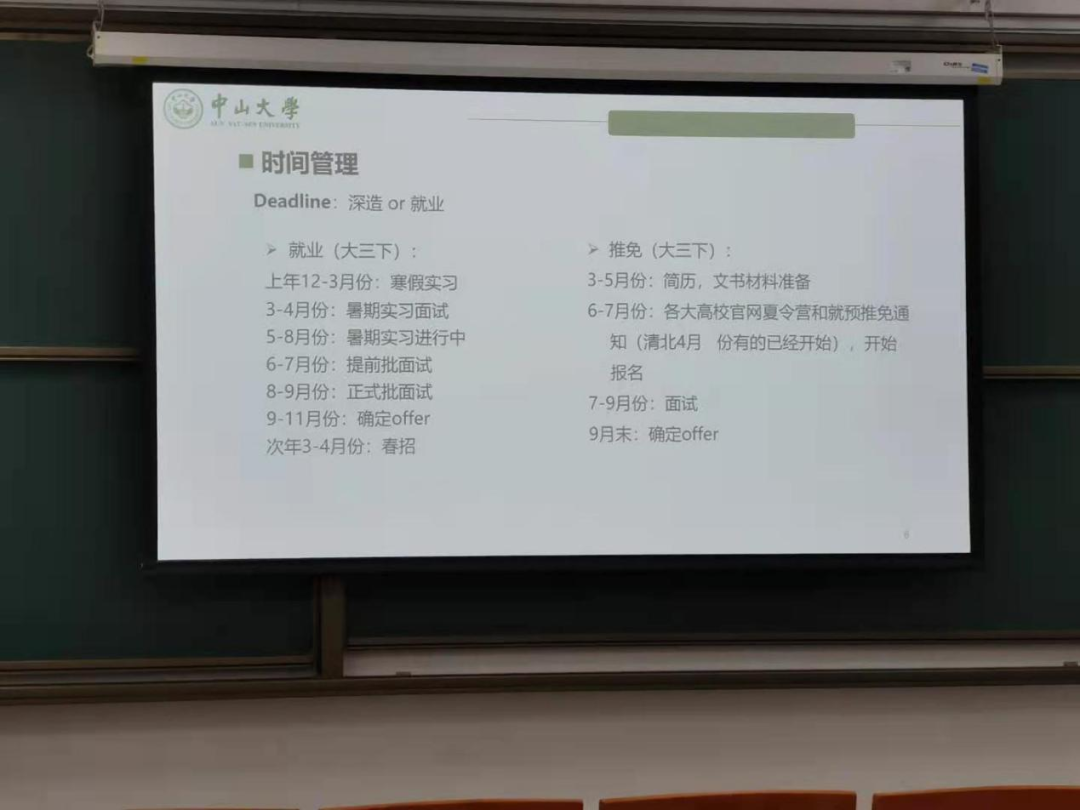 在时间管理方面,陈焕泽学长提出两点建议:1.规律的作息是时间管理的基础;2.明确的目标是时间管理的动力。在长期的时间管理上,陈焕泽学长先指出要确定长期的目标:深造or就业。陈焕泽学长举出了选择保研或者就业的学长本科四年的时间线,以这些学长的本科经历为例子,讲述了选择不同方向的学长是如何安排管理自己的时间。陈焕泽学长认为,不一定要每一门的科目都很厉害,可以有所选择地去学习,按照自己的目标制定每个课程的完成度。学长说不同的人有不同的时间管理,可以具体通过自身的目标去制定。最后学长总结道,根据目标选择完成度,批量处理相似的事务,不要轻易放弃看似代价很高的兴趣爱好。