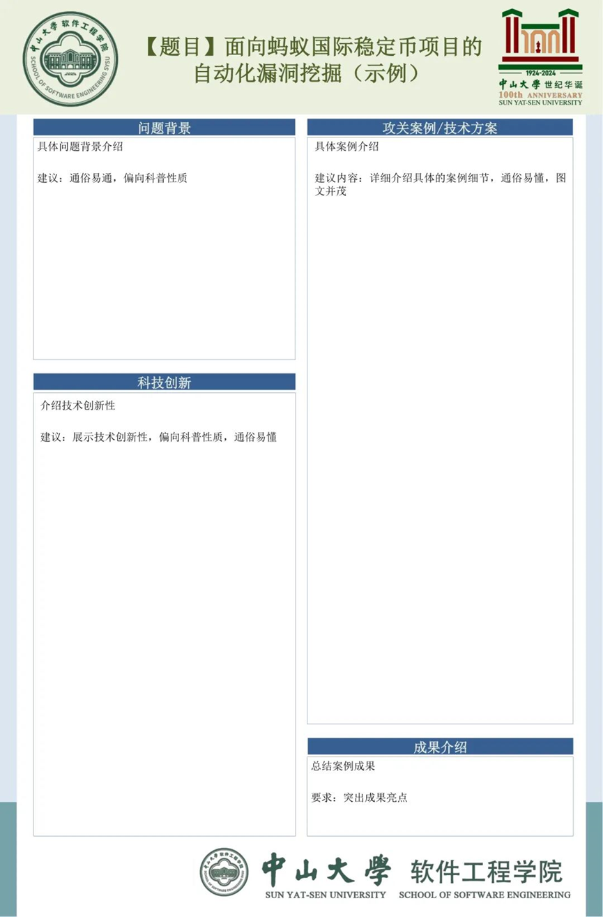 在中山大学百年华诞之际,软件工程学院特此举办产学研成果展示大赛,活动旨在进一步激发在校大学生的创新潜能,培育科研精神。我们诚邀全院师生汇聚智慧与创意,共同参与。
