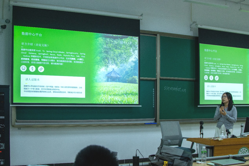“SSE-Market”(学院学生自主信息交流平台)项目团队负责人吴仰晖给新生详细讲解了项目从需求调研、产品设计到落地实现的全过程。他介绍了团队如何通过技术手段解决师生信息差问题,并实现师生资源共享,形象展现了团队协作和技术创新在解决校园实际问题中的价值。