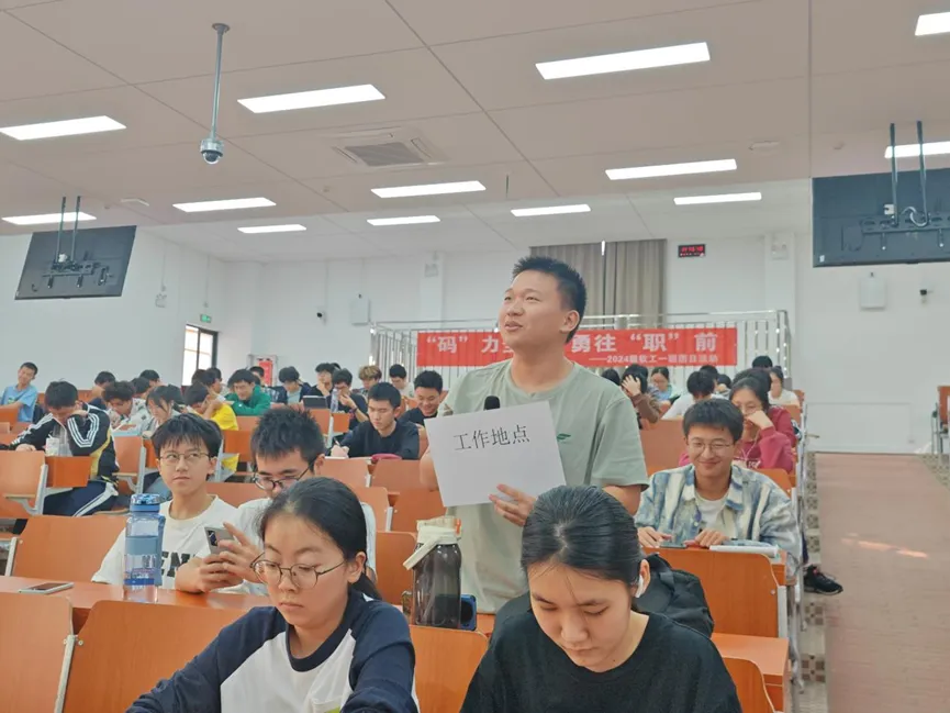 本次活动以企业参访+交流座谈+求职小剧场+职业价值观拍卖+模拟面试相结合的形式开展。邀请了和元达信息科技有限公司的人力资源总监黄艳芳女士和校园招聘负责人黄璐女士作为嘉宾,学院党委副书记蓝澍德老师、辅导员周玉婷老师、2024级本科生共150余人参加。