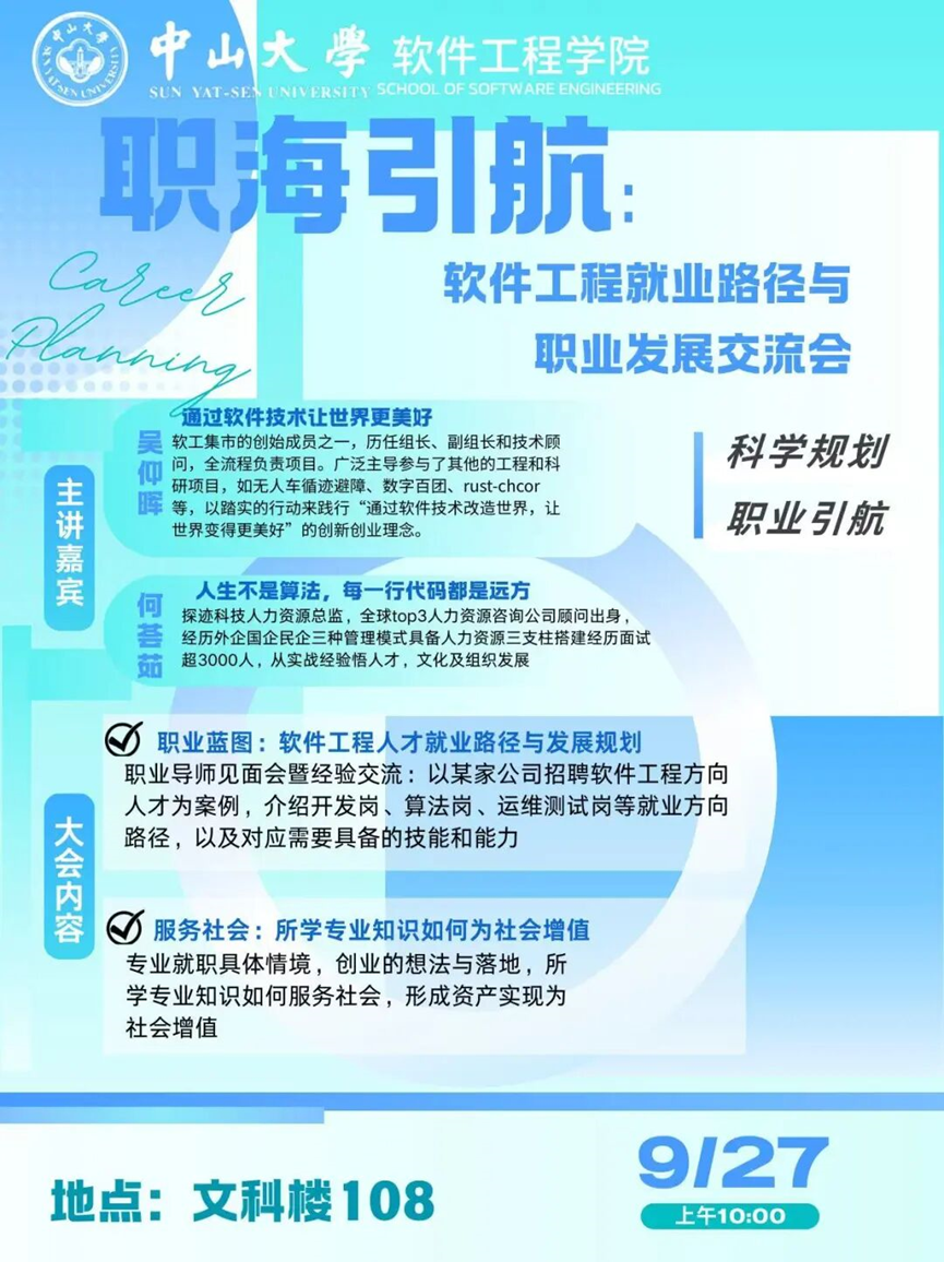 2025年9月27日上午,第四期活动以“职海引领:软件工程就业路径与职业发展交流会”为主题,在南校园文科楼108举行。本次活动由探迹科技人力资源总监何荟茹校友、Shopee前端工程师与“软工集市”创始成员之一吴仰晖校友主讲。