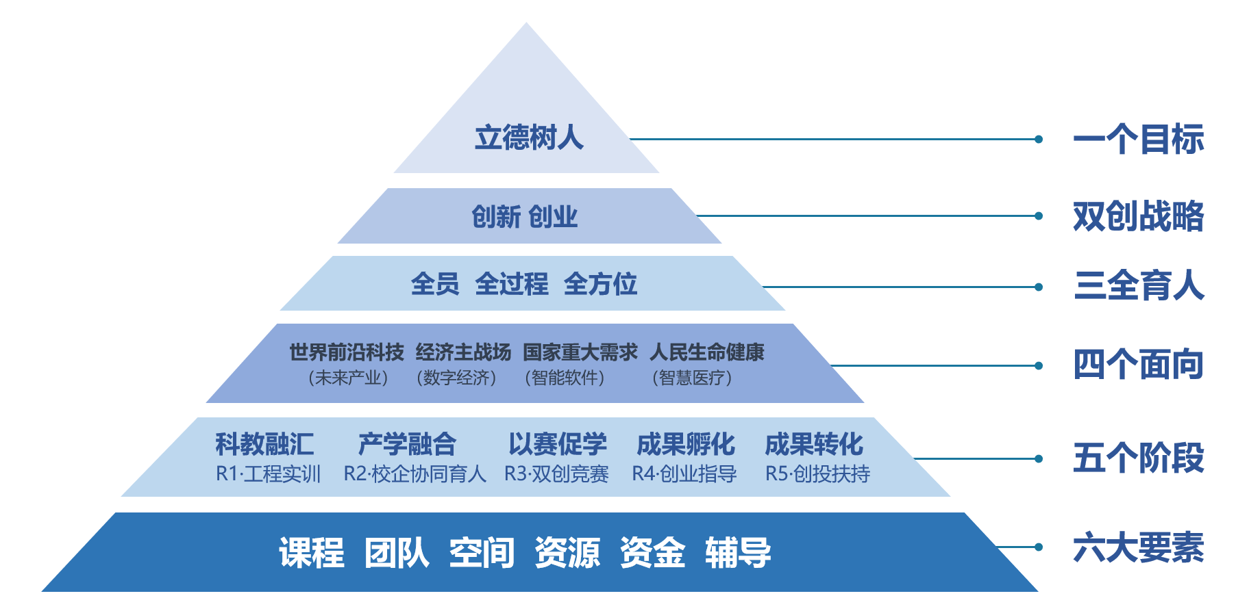在“科创者计划”的基础上,Blue Hub构建了“1+2+3+4+5+6”的科技创新创业教育金字塔体系,即立足立德树人根本目标、面向双创战略、落实三全育人、坚持四个面向、构造五个阶段、聚合六大要素。基于课程、团队、空间、资源、资金、辅导六大要素,构造工程实训、校企协同、双创竞赛、创业指导、创投扶持的五阶段育人闭环,聚焦培养能在未来产业、数字经济、智能软件、智慧医疗领域有所作为的大学生CEO、CTO、COO。