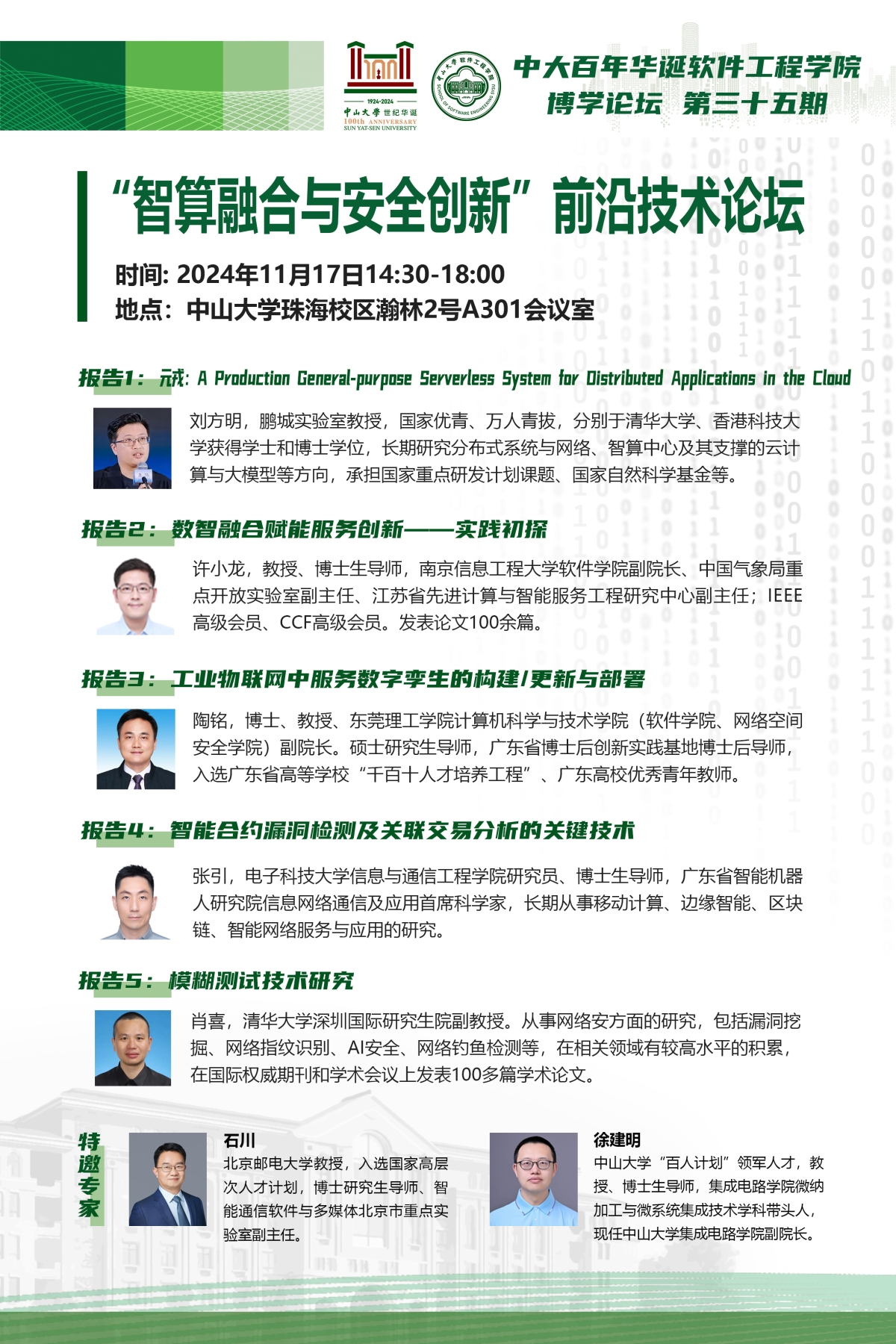 导航痕迹 中山大学软件工程学院 博学论坛第三十五期:“智算融合与安全创新”前沿技术论坛 扫描此二维码分享 博学论坛第三十五期:“智算融合与安全创新”前沿技术论坛 发布人:林柱良 发布日期:2024-11-18 活动时间 2024年11月17日 14:30 - 2024年12月17日 18:00 活动地址 珠海校区瀚林2号A301